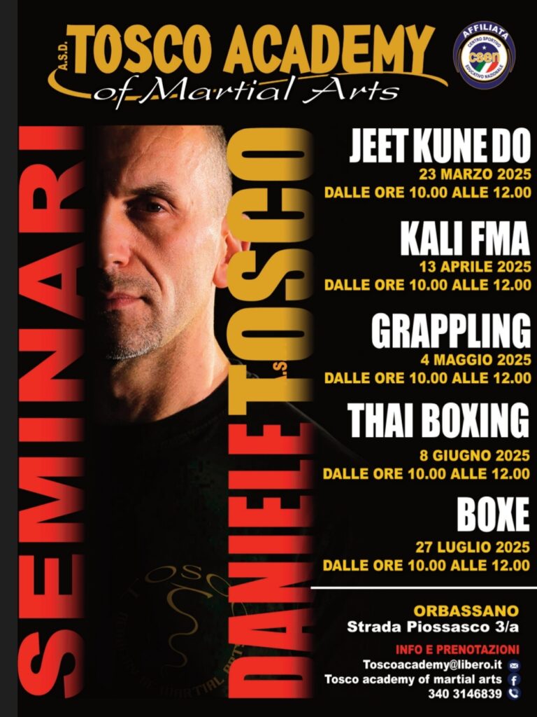 L’ a.s.d. Tosco Academy of Martial Arts è un’accademia dedita alla diffusione e promozione di sport da combattimento ed arti marziali. Nello specifico vengono insegnate le seguenti discipline: Free Punch, Kickboxing, K1 style, Thai Boxe, Grappling, M.M.A, Jun Fan Gung Fu – Jeet Kune Do, Kali, Panantukan, Silat, e Self defence. I corsi di tutte le discipline, sono strutturati in maniera tale da poter accogliere e far crescere a tutti i livelli, neofiti, intermedi ed avanzati. L’accademia, luogo di crescita tecnica e morale, si prefigge lo scopo di educare le persone alla conoscenza di se stessi, e del grande potenziale nascosto dentro ognuno di noi. I corsi, sono tenuti tutti direttamente dal M°Daniele Tosco, ad Orbassano, presso la sede della Tosco Academy of Martial Arts.